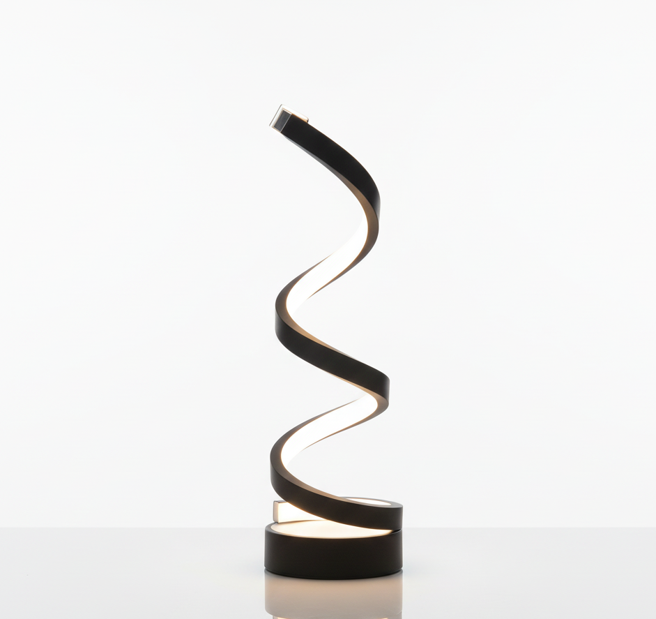 Cette lampe de table présente une structure en forme de double spirale ou hélice verticale.